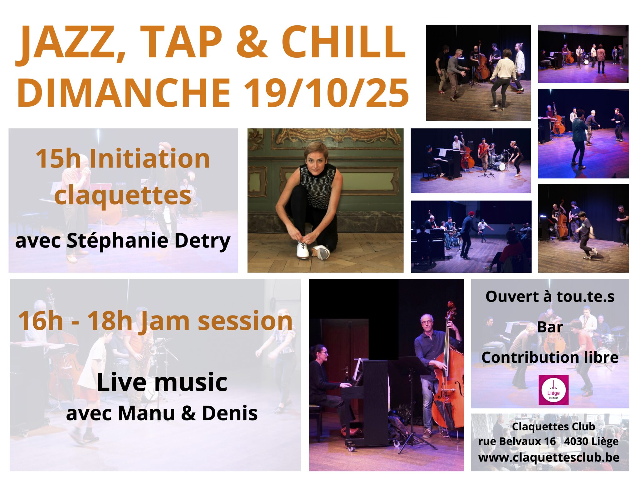 Les jam sessions du Claquettes Club, Jazz, Tap & Chill sont ouvertes à tout le monde: on peut être un simple spectateur, prenant plaisir à écouter les musiciens et regarder les danseurs. Mais on peut aussi s’impliquer beaucoup plus activement, en se lancant dans l’aventure de l’improvisation claquettes ou musicale, peu importe le niveau d’expertise.
